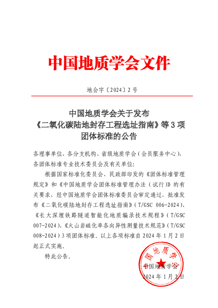 中国地质学会关于发布《二氧化碳陆地封存工程选址指南》等3项团体标准的公告