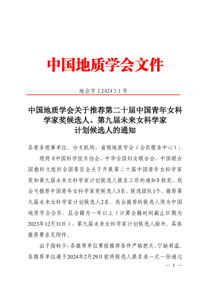 中国地质学会关于推荐第二十届中国青年女科学家奖候选人、第九届未来女科学家计划候选人的通知