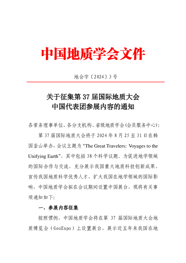 关于征集第37届国际地质大会中国代表团参展内容的通知